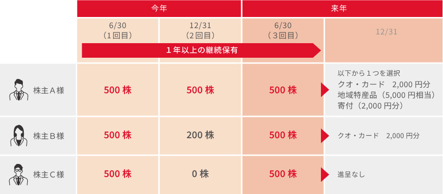 「1年以上の継続保有」は、毎年6月30日及び12月31日を基準日とする株主名簿に基づいて判定します。
